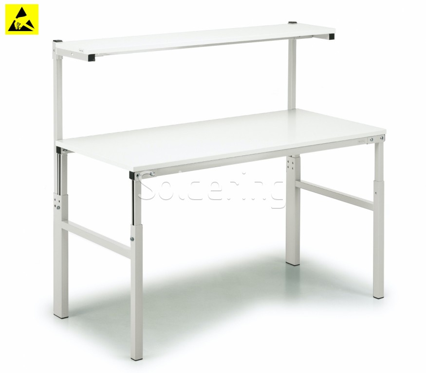 - Konštrukcia rovnaká ako TP stolov, navyše obsahuje zvislé profily a antistatickú / ESD - laminátovou policu hĺbky 310 mm.