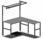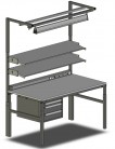 - Priemyselný pracovný stôl so zvislým profilom určeným pre montáž príslušenstva a policou.