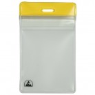 ESD / antistatická visačka na menovky, ideálne pre pracovníkov v elektropriemysle, pracujúci s komponentmi citlivými na ESD. Vertikálne, so zipsom, rozmery 68 x 107 mm, bez klipu.