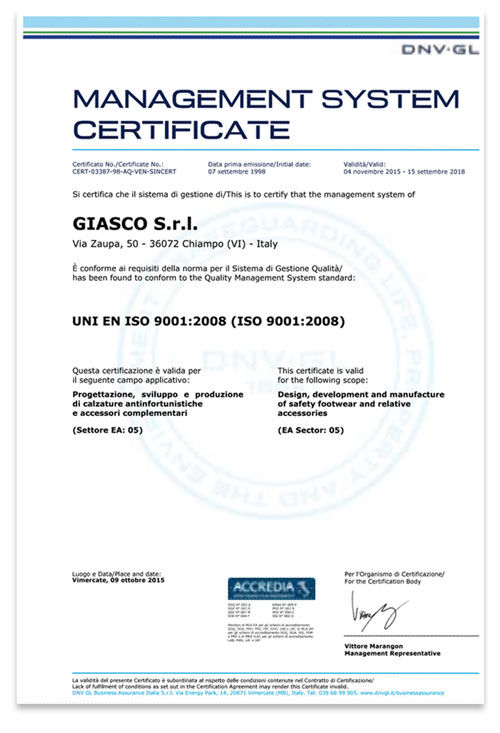 Sjednocenost v rozmanitosti a silné nadšení při výrobě bezpečností obuvi, to vše spojuje na mezinárodním trhu značka "Made in Italy", poskytující certifikované produkty pro ochranu a zdraví nohou. Cílem společnosti Giasco srl. je nabídnout svým prodejcům špičku v oblasti technologií a komfortu, která je schopna zajistit pracovníkům plnou ochranu před všemi nebezpečími v různých pracovních situacích, a tím zajistit úplnou bezpečnost.