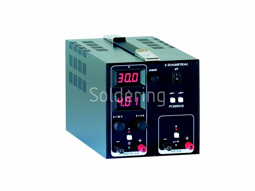 Laboratórny zdroj P130R51D je určený do každej profesionálne i amatérske laboratória. Jeho vlastnosti ocenia najmä vývojoví technici, opravári spotrebnej elektroniky, výrobné podniky a v neposlednom rade tiež odborné školy. Je vybavený jedným zdrojom s plynulou reguláciou napätia v rozsahu 0 ÷ 30V s možnosťou nastavenia obmedzenia prúdu od 0.1 ÷ 4A. Tento model disponuje navyše pevným zdrojom napätia 5V / 3A. Regulovateľná časť zdroja je vybavená meracími prístrojmi ako pre napätie, tak i pre prúd. Indikácia obmedzenia prúdu je prevedená blikajúcou desatinnou bodkou na prúdovom meracom prístroji a prerušovaným zvukovým signálom. Tento zvukový signál je možné podľa potreby vypnúť. Výstupy jednotlivých zdrojov sú ovládané samostatným tlačidlom s kontrolkou pre ich jednoduchú obsluhu. Vďaka tomu nie je nutné vypínať celý laboratórny zdroj pri práci. Proti tepelnému preťaženiu je vybavený teplotným senzorom a ventilátorom, ktorý v prípade potreby chladiča výkonových prvkov ochladí na prijateľnú hodnotu. Transformátor je dostatočne dimenzovaný pre trvalú dodávku maximálneho výkonu do záťaže. Celá elektronika je umiestnená v robustnom kovovom šasi s povrchovou úpravou Comaxit - čierna farba RAL 9005.