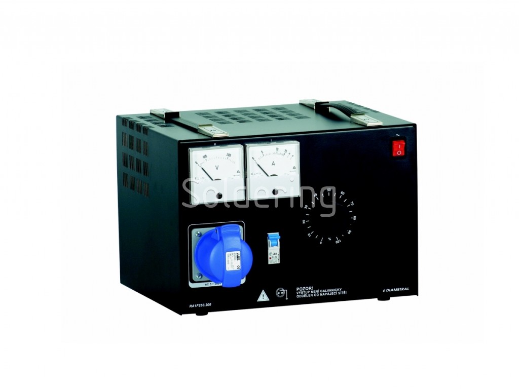 Autotransformátor RA1F250.200 (bez obrázku) je vybavený jedným regulovateľným, od napájacej siete neoddelenými zdrojom striedavého napätia v rozsahu <5 ÷ 230 V s maximálnym odberom prúdu 20 A. Výstup istený ističom. Zapnutie zdroja je indikované podsvieteným vypínačom. výstup zdroja je prevedený panelovou zásuvkou 230v. hodnoty výstupného napätia a prúdu sú zobrazené na analógových meracích prístrojoch. Transformátor je dostatočne dimenzovaný pre trvalú dodávku maximálneho výkonu do záťaže. Sieťový prívod je prevedený neoddeliteľne.