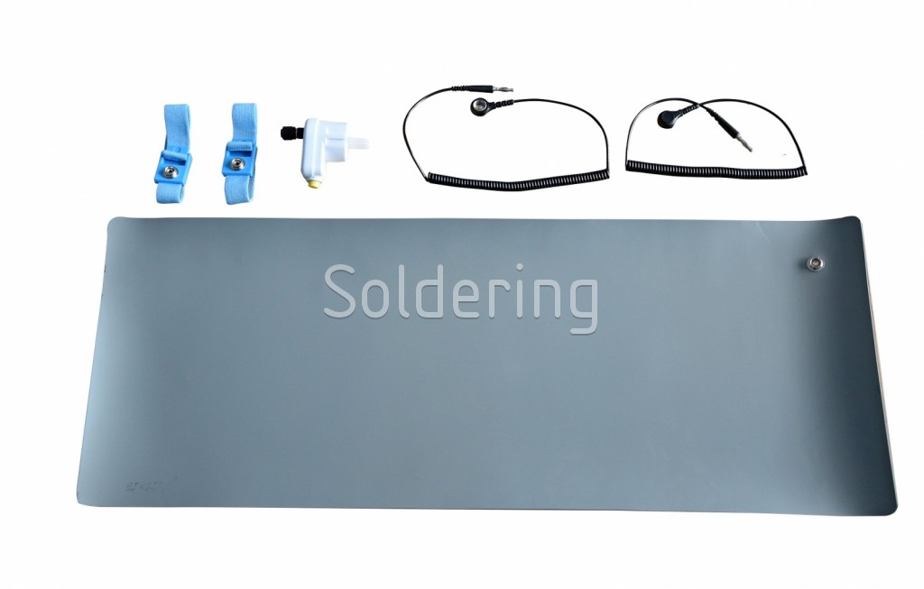 Antistatický set obsahuje dva uzemňovacie náramky, prepojovací uzemňovací kábliky, uzemňovací vidlicu do zásuvky a ESD / antistatickú podložku s rozmermi 250 x 650 mm.