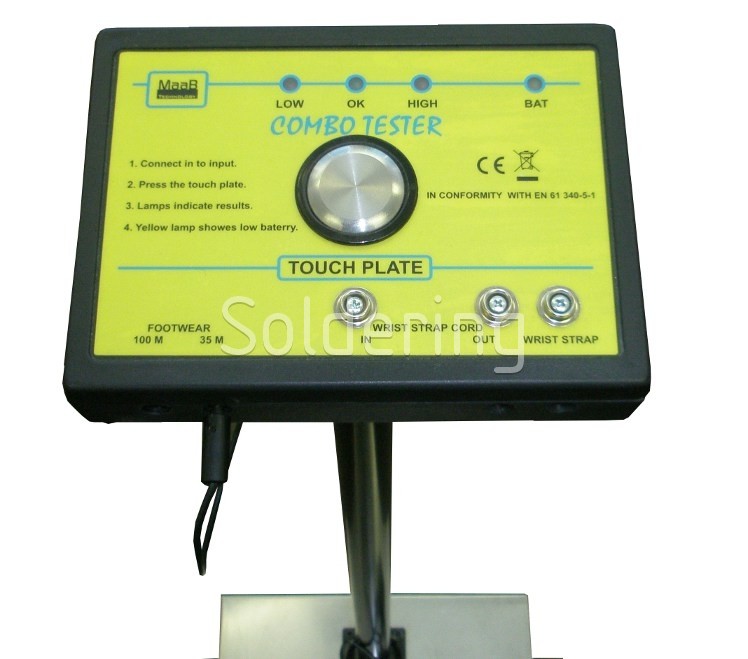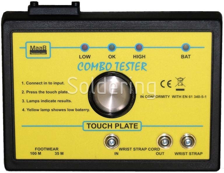 - Combo tester je kontrolní přístroj určený k testování ochranných přizemňovacích náramků, přívodů k náramkům a antistatické obuvi používaných na antistatických pracovištích ve vyhrazeném prostoru podle normy EN 61 340-5-1. Uvedená norma předepisuje denní kontrolu způsobilosti těchto náramků a obuvi.