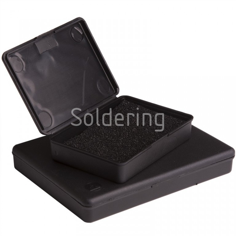 - ESD / antistatická plastová škatuľka určená na ochranu ESD citlivých predmetov.