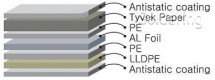 - Vrstvy materiálu Tyvek: Tyvek - 170μm ± 60μm / LDPE - 25m / AL foil - 7μm / LDPE - 25μm / LLDPE - 80μm / A / S coating.