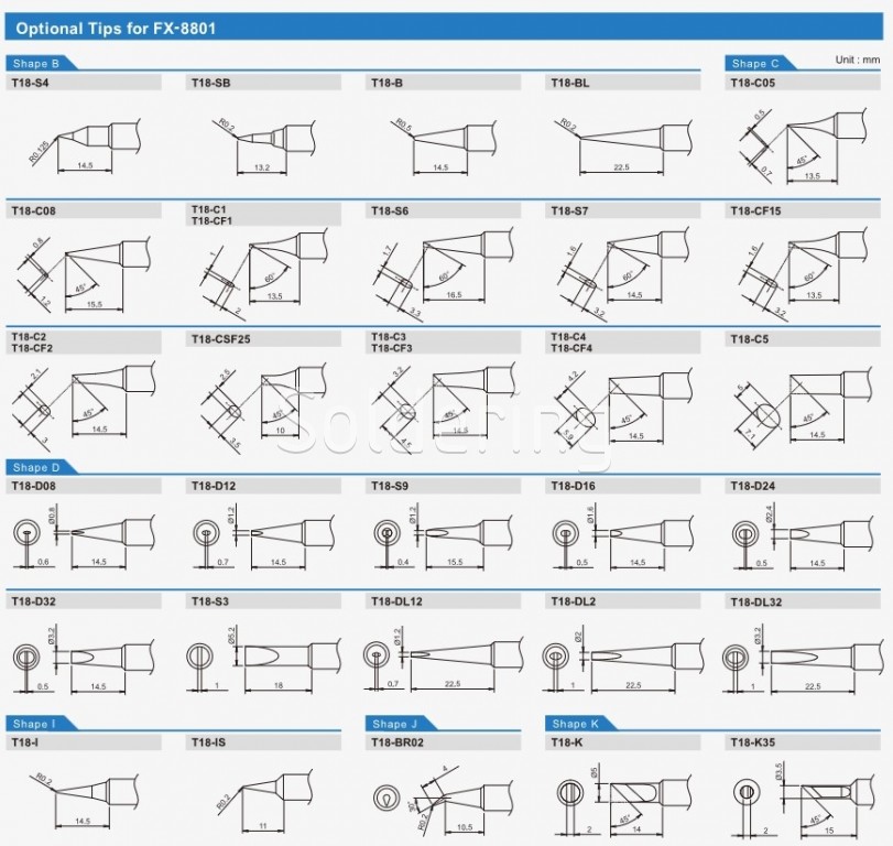 Pre štandardnú spájkovaciu rúčku FX-8801 sú k dispozícii spájkovacie hroty série T18.