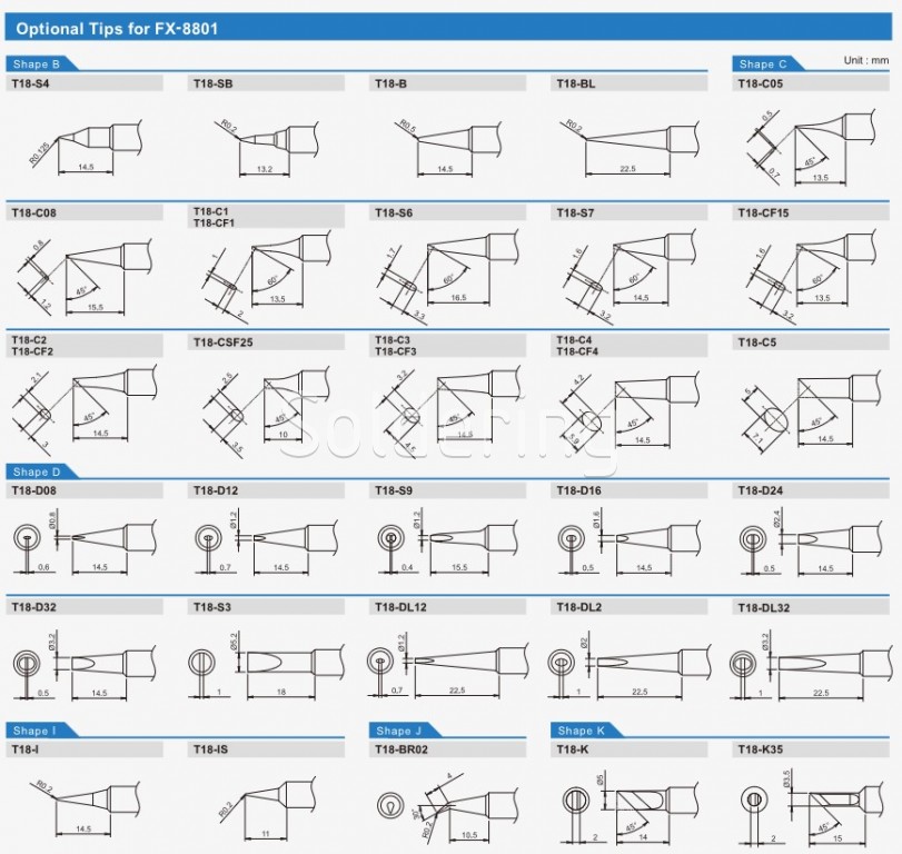 Pre štandardnú spájkovaciu rúčku FX-8801 sú k dispozícii spájkovacie hroty série T18.