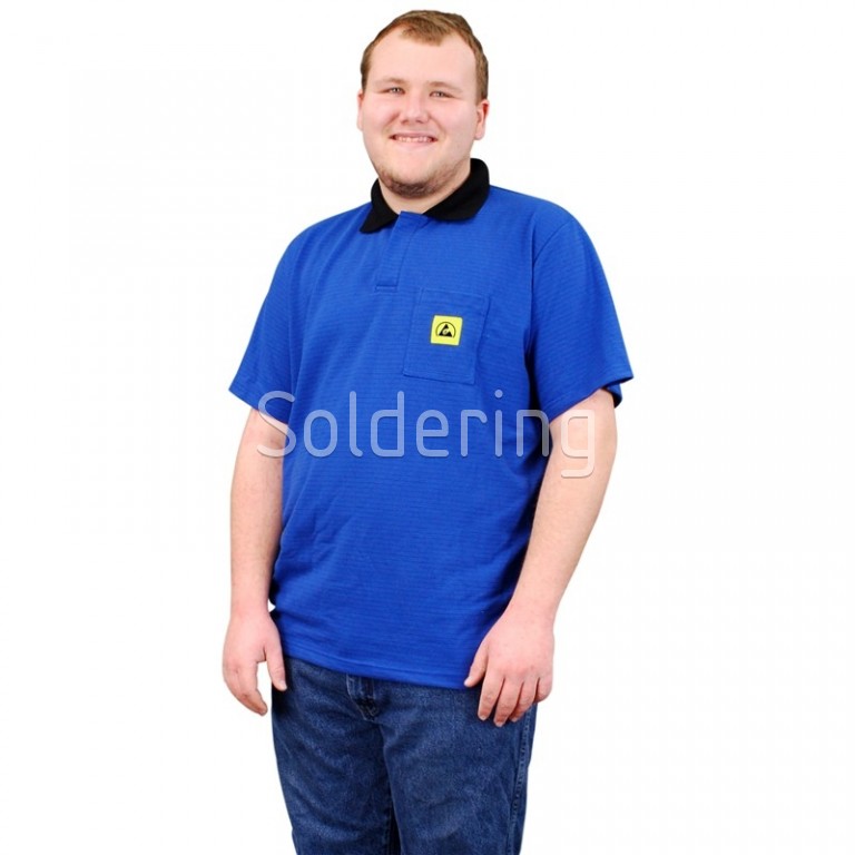 ESD / antistatické tričko s krátkymi rukávmi, golierom a náprsným vreckom. Zapínanie pomocou gombíkov pri krku. Farba kráľovská modrá, veľkosť XS.