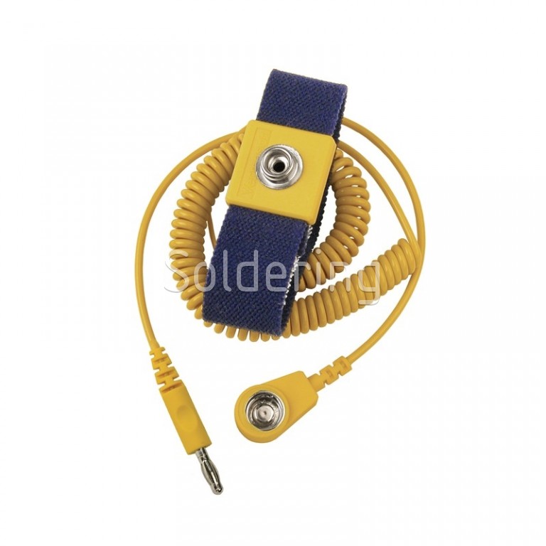 - Sada obsahujúca modrý nastaviteľný ESD / antistatický uzemňovací náramok a žltý krútený uzemňovací kábel.