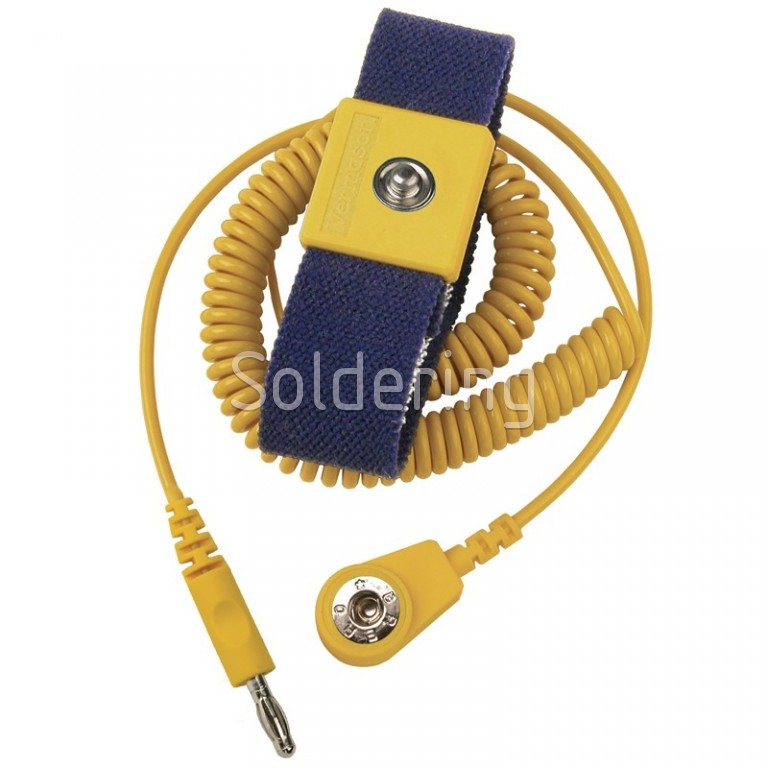 - Sada obsahujúca modrý nastaviteľný ESD / antistatický uzemňovací náramok a žltý krútený uzemňovací kábel.