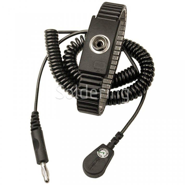 - Sada obsahujúca kovový nastaviteľný ESD / antistatický uzemňovací náramok a čierny krútený uzemňovací kábel.