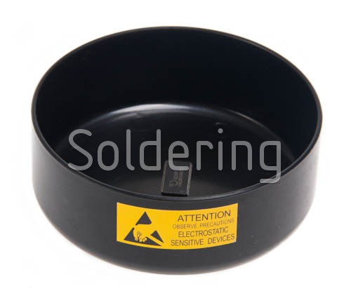 Antistatický guľatý zásobník na SMD komponenty a iné malé súčiastky, vyrobený z vodivého plastu. Okrúhly, rozmery 120 x 45 mm, čierny.