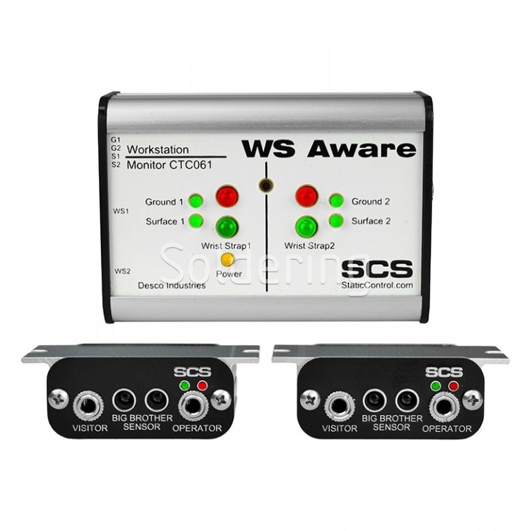 - Priebežne sleduje integritu uzemnenie dvoch operátorov, dvoch vodivých alebo disipatívnych plôch a dvoch kovových nástrojov.