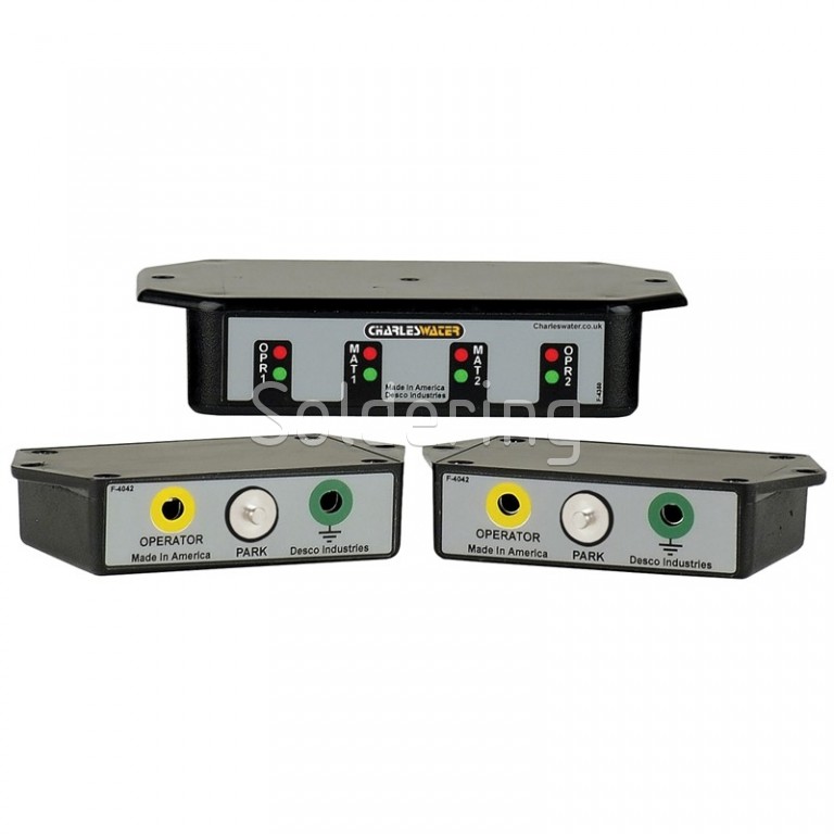 Kontinuálny monitor pre dve pracovné stanice, ktorý priebežne kontroluje integritu uzemnenie dvoch operátorov a dvoch ESD pracovných povrchov.