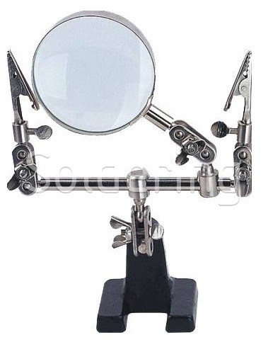 Podpora pre dosky plošných spojov, káble, komponenty. Priemer lupy 62 mm, zväčšenie 2,5x. Hmotnosť 400 g.