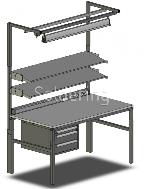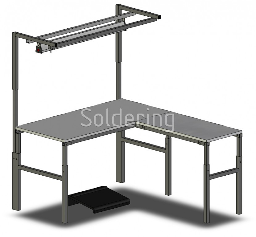 Výška sa nastavuje pomocou imbusu medzi 650 a 900 mm. Pracovný stôl so zvislými profilmi a laminovanou policou, nastavenie výšky medzi 1080 a 1550 mm, nosnosť 50 kg. Konštrukcia je rovnaká ako pri stole TP.