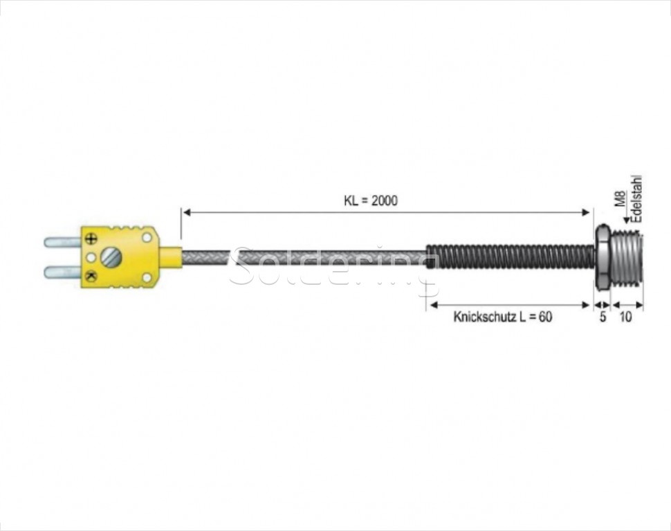 Naskrutkovateľné čidlo s vonkajším závitom M8 z nerezovej ocele. Termodrát 2 m, izolovaný skleným vláknom, vonkajší plášť vystužený nerezovou oceľou.