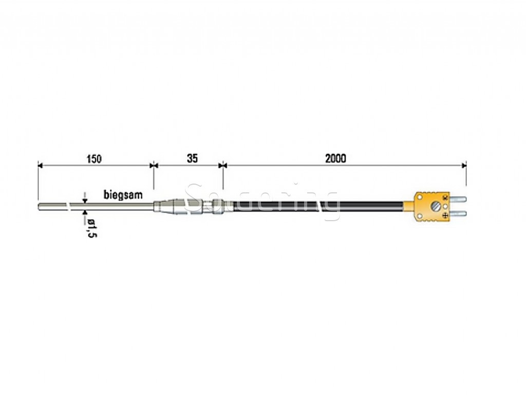 Plášťový termočlánok s 2 m vyrovnávacím káblom z PVC. Dĺžka prvku Incocell 150 mm, Ø 1,5 mm.