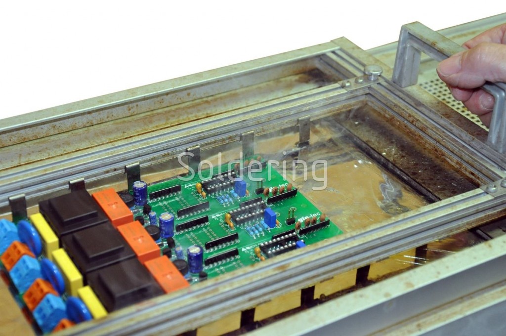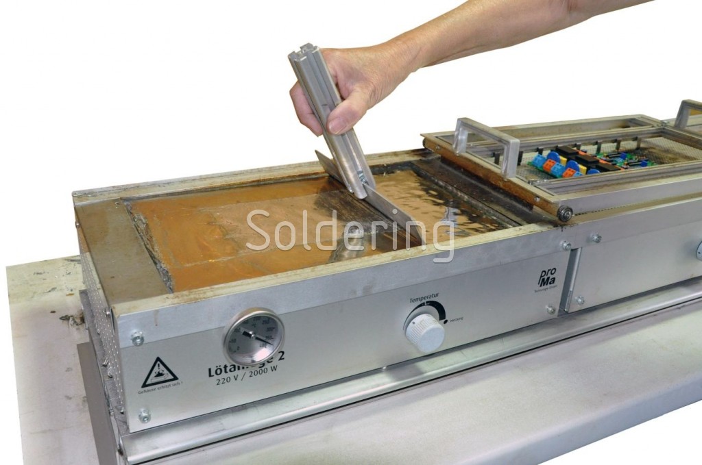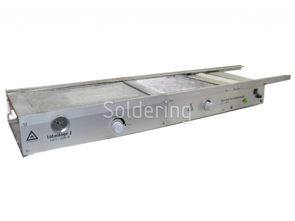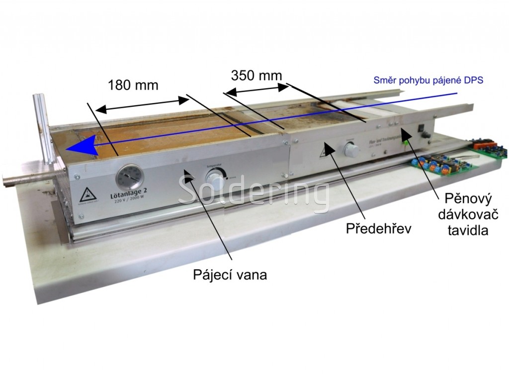 Spájkovacia linka GTA pracuje na princípe statické spájkovacie kúpele (ponorné spájkovanie, spájkovanie vlečením) a potrebuje k svojmu ohrevu veľmi krátku dobu. Veľkosť dosky 180 x 180 mm, teplota kúpeľa max. 360 °. Linka je určená pre prototypy a krátke séria, drobnú výrobu. Spájkovacia rámček je určený pre DPS 180 x 180 mm. Šírka dráhy, koľajnice, po ktorej je vedený rámček je 180 mm. 180 mm je maximálna šírka spájkovanie.