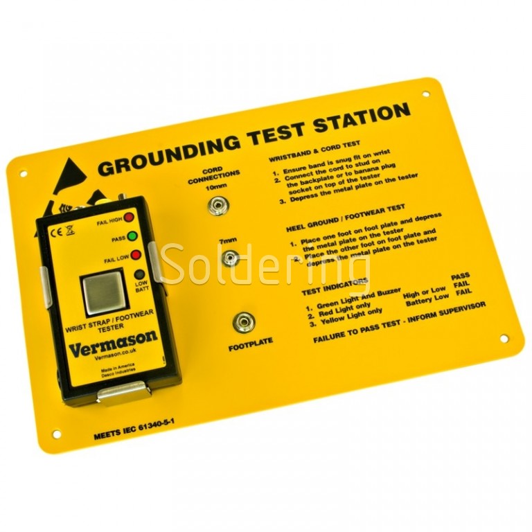 - Tester ESD / antistatický uzemňovacích náramkov, ktorý spĺňa základné požiadavky normy EN 61340-5.