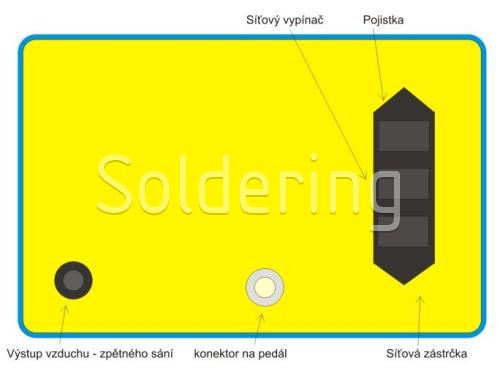Dispenzer je konštrukčne riešený v kovovej krabici. Napájací prívod s hlavným vypínačom a istiacim prvkom, vstup tlakového vzduchu a výstup pre pedál sú na zadnom paneli. Výstupný konektor vzduchu, ovládacie prvky - regulátor výstupného tlaku a podtlaku, prepínač módu, programovacie tlačidlá a displej - sú na prednom paneli. Programovanie je možné uzamknúť, aby bola znemožnená jeho nechcená manipulácie.