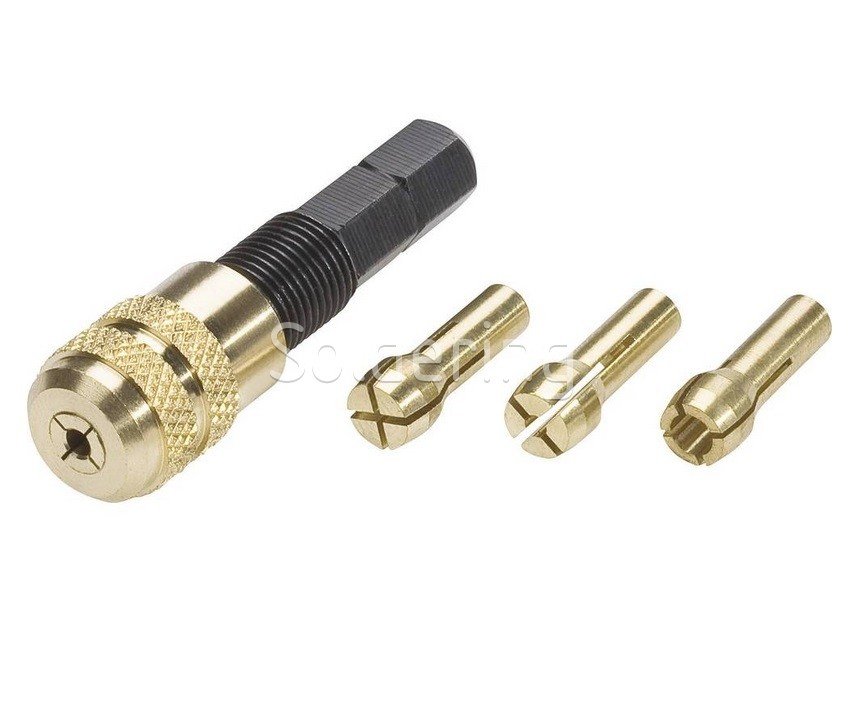 Klieštinové skľučovadlo sa skrutkovacie čiapočkou a štyrmi klieštinami. Rozsah upínania 0,3 - 3,2 mm, vreteno Ø 6,3 mm (1/4 ").