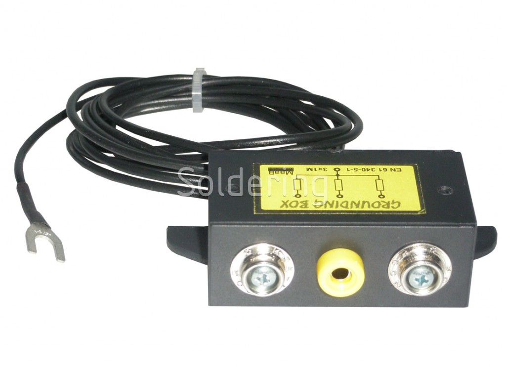 Uzemňovací box tvorí plastová krabička, na ktorej čele sú tri pripojovacie miesta. Z krabičky vychádza 2,5 m dlhý vývod, ktorého zakončenie je otvorené káblové oko. Vnútorné prepojenie svoriek je buď cez ochranné rezistory 1 MOhm alebo priame. Jednoduchá montáž dvomi skrutkami M3 alebo vrutmi Ø 3 mm na spodnej pracovnej plochy stola alebo police. Plastový kryt je vystužený stĺpiky proti možnému pretiahnutia.