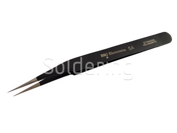 - Oceľová pinzeta pokrytá epoxidovou farbou, s veľmi ostrými a mierne zahnutými špičkami.