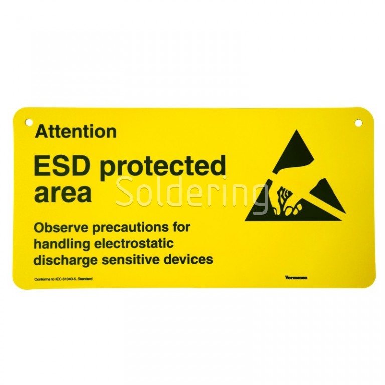 ESD / antistatický štítok označujúci vstup do chránených priestorov EPA. Rozmery 300 x 150 mm, PVC s hrúbkou 3 mm, ošetrené antistatickým povlakom. Dva otvory na zavesenie.