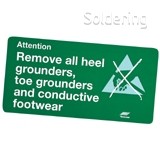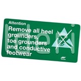 ESD / antistatický štítok označujúci nutnosť odobraní osobných zemniacich prvkov, pätových pások a ESD obuvi. Pripomína zamestnancom, že pri opúšťaní EPA by si mali dať dole ESD obuv, čím výrazne predĺži jej životnosť. Rozmery 600 x 300 mm, PVC s hrúbkou 3 mm, ošetrené antistatickým povlakom.