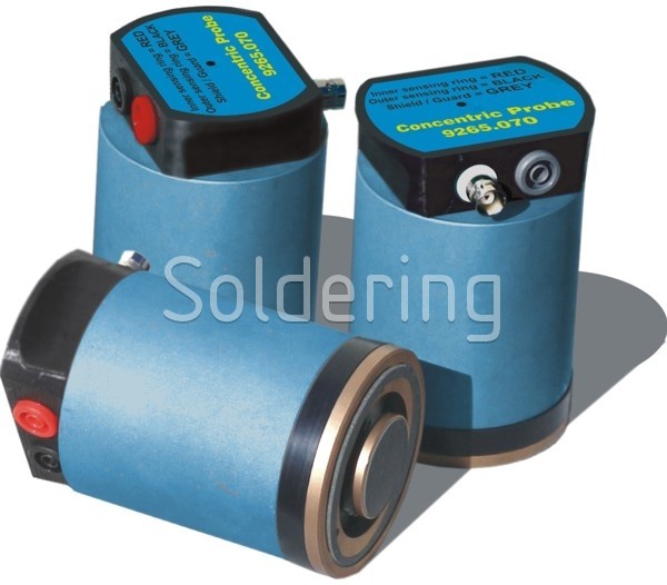 Skúšobná valcová sonda určená na testovanie povrchového odporu. Priemer sondy 63/30 mm, hmotnosť 2,3 kg, jedna BNC zdierka, štyri 4 mm zdierky.